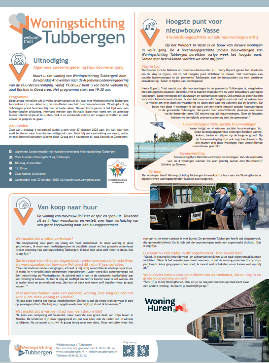 Ook leest u dat onze Huurdersvereniging haar jaarlijkse vergadering organiseert. Huurders van Woningstichting Tubbergen zijn van harte welkom op dinsdag 4 november. Aanmelden kan nog tot 27 oktober.