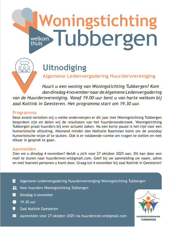 Zien we u dinsdag 4 november? Meldt u zich voor 27 oktober 2025 aan. Dit kan door een mail te sturen naar huurdersver.wt@gmail.com. Geef bij uw aanmelding uw naam, adres en met hoeveel personen u komt door.